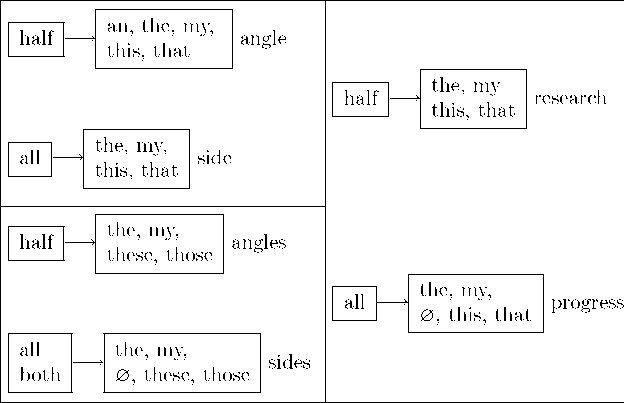 47 ![]() so/as/too/how + adjective +a/an + noun such a/an + adjective + noun quite/rather + a/an + adjective + noun rather + a/an/the + noun a quite/rather + adjective + noun Вот еще родственная серия правил: При этом не следует писать such a/an + adjective + noun, когда Вы на самом деле имеете в виду so + adjective + a/an + noun. Заметьте также, что such a/an + noun предполагает gradeability. Между прочим, по мнению Э. Патриджа “quite does not — in good English — means ‘rather’; its two standard senses being (i) ‘completely, wholly, entirely, to the fullest extent’... (ii) ‘actually, truly, positively’.... ” Из следующей таблицы видно, как употреблять predeterminer типа all, both, half: [C] [U] [S] ![]() [P] Отметьте для себя также конструкции типа all of us, each of them, one of you, etc. В сочетаниях подобного рода с существительными обязателен непустой определитель: some of the integrals, any of Banach’s theorems, most of the difficulties, etc. Отсутствие определителя, вообще говоря, уничтожает of. Еще деталь — помните варианты “all the space” и “the whole space.” Пользуйтесь табличкой: