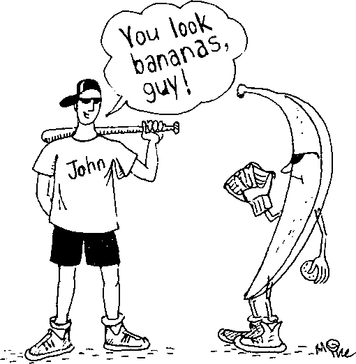 bananas suits are really great! Переводчик переводит: — Это фантастика! (пока все правильно). Их банановые костюмы просто класс! А вот тут уже маленькая ошибка. Не было у “На-На” никаких банановых костюмов. Но американские зеленоволосые “нанайцы” наперебой стали выкрикивать: — Yeah, they* re so bananas! — Они такие классные! — переводил наш парень чертыхаясь, видимо, в сердцах:” — И чего это они заладили свои “ бананас ”!” А того и заладили, что у американцев слово Bananas употребляется как Crasy, т.е. сумасшедший, необычный, придурковатый, шизанутый, прикольный, поехавший и т.д. В принципе, переводчик правильно перевел диалог с представителями американской субкультуры, хоть этот бананас и несколько сбил его с толку в самом начале. Но нас-то это уже наверняка не смутит. Мы теперь знаем, что все это значит.