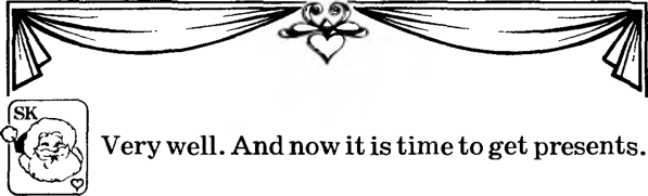 Звучит музыка, Санта Клаус раздает подарки, а Король и Королева помогают ему. А теперь, дорогие мои маленькие подданные, давайте поздравим ваших пап и мам, дедушек и бабушек, всех наших гостей с Новым годом. ![]() 19 ![]() |