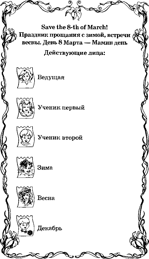 Необходимо подготовить заранее: место для выставки картин, поздравления (подарки) мамам, волшебную корзинку с записками, плакат «Happy Mother’s Day!», костюмы Весны, Зимы, 8 Марта, Снежинок, Подснежников,Снега, Листиков, зимних и весенних Месяцев, сладости для праздничного стола.