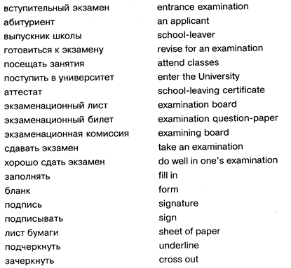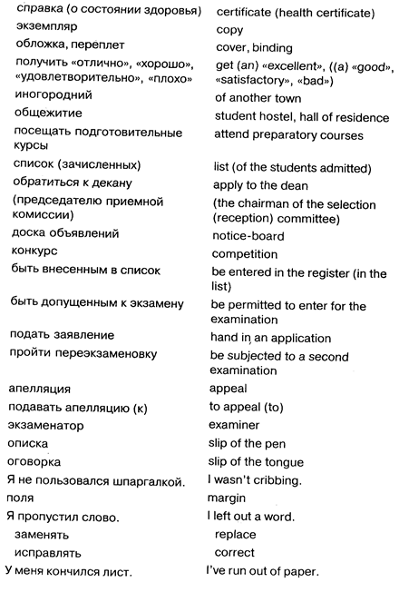 В словарь входят слова и выражения, которые относятся не к вопросам, содержащимся в билете, а к предметам и понятиям, связанным с ходом самих экзаменов. Здесь приводится необходимый запас слов.