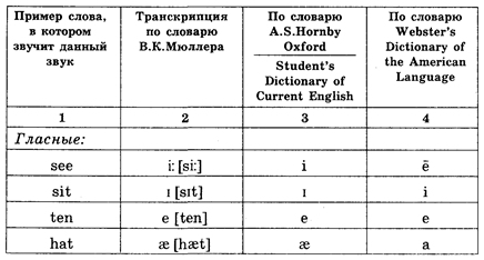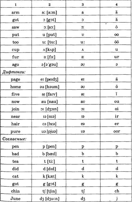 Есть разные способы обозначения звуков, и единой, установленной во всем мире системы нет. Мы приводим фонетическую транскрипцию согласно традиции, идущей от словаря Даниэля Джоунза, которая была наиболее распространена в нашей стране и использована в таком известном словаре, как словарь В. К. Мюллера. Рядом для сравнения показаны другие способы условных обозначений, запоминать которые не обязательно. Достаточно твердо знать лишь один основной вид транскрипции.