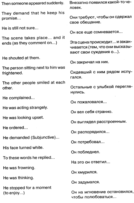 При таких пересказах требуется определенная фантазия, так как пересказ будет идти в первом лице, от человека, за которого вам придется говорить «я», поэтому дома обязательно несколько раз потренируйтесь. Возьмите любую страницу художественного текста и попробуйте ее пересказать от лица присутствующих там или даже придуманных вами персонажей. Тогда на экзамене вы не будете испытывать чисто психологической неловкости, когда понадобится несколько минут выступать в роли другого человека. Не думайте, что все может быть так просто, как кажется, и что на экзамене такое «раздвоение» получится само собой. Для многих важно создать привычку, так как в непривычной ситуации, да еще на экзамене, под пристальными взглядами членов комиссии, человек может растеряться и, даже неплохо владея языком, сделает такой пересказ, который будет тяжелым, напряженным и способным даже вызывать некоторое раздражение. Приятное впечатление помимо правильности речи произведет и непринужденность пересказа, даже если вы должны делать его от чужого лица. Чтобы избежать монотонности («он сказал», «он сказал»), желательно в пересказе использовать достаточно широкий спектр красок и оттенков («он добавил», «он заметил», «на лице его отразилось...»).