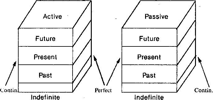 Где разместить пассивные конструкции? Вопрос этот для того и ставится, чтобы четко понять: деление на актив и пассив является для англ. глагола всеобъемлющим. Любая временно! конструкция может быть (в принципе) выражена в активной и в пассивной форме. Так что в рамках нашей модели надо возвести второе здание
