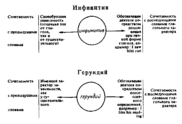 297 ![]() Сочетаемость инфинитива и герундия с предыдущими словами и сочетаемость их с последующими словами можно графически изобразить следующим образом: