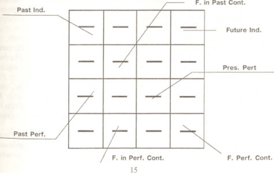 Каждая ячейка разделена на две части. В нижней половине находятся соответствующие формы глагола го be. В ячейках Pres. Ind. и Past Ind. глагол to be просто изменяет свою форму (am, is, are — для Pres. Ind. и was, were — для Past Ind.), в других ячейках соответствующая форма глагола образуется с помощью простой подстановки инфинитивной основы в общую (записанную в верхней половине) «формулу» сказуемого.