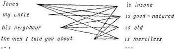 Различия референтного и атрибутивного употребления определённой дескрипции проявляются и в характере семантической связи между дескрипцией и предикатом. При референтном употреблении нет смысловой зависимости между способом наименования и предицируемым признаком. Так, равно возможны все отраженные в приведённой ниже схеме связи: